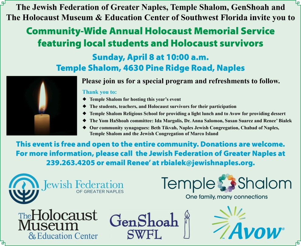 The community is invited to attend Yom HaShoah Commemoration at Temple Shalom.