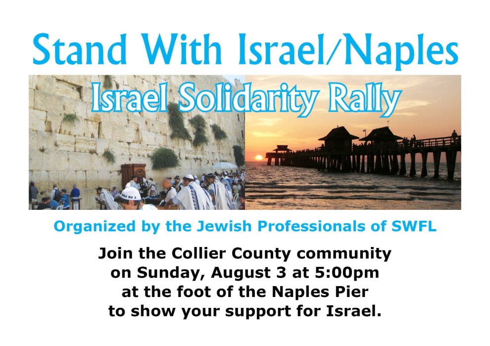 Stand With Israel Community-Wide Israel Solidarity Rally Join the Collier County community on Sunday, August 3 at 5:00pm at the foot of the Naples Pier to show your support for Israel. Sponsor: Jewish Professionals of SWFL