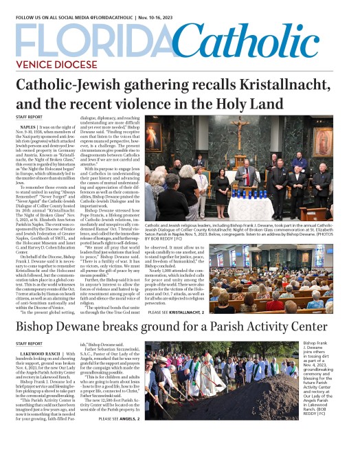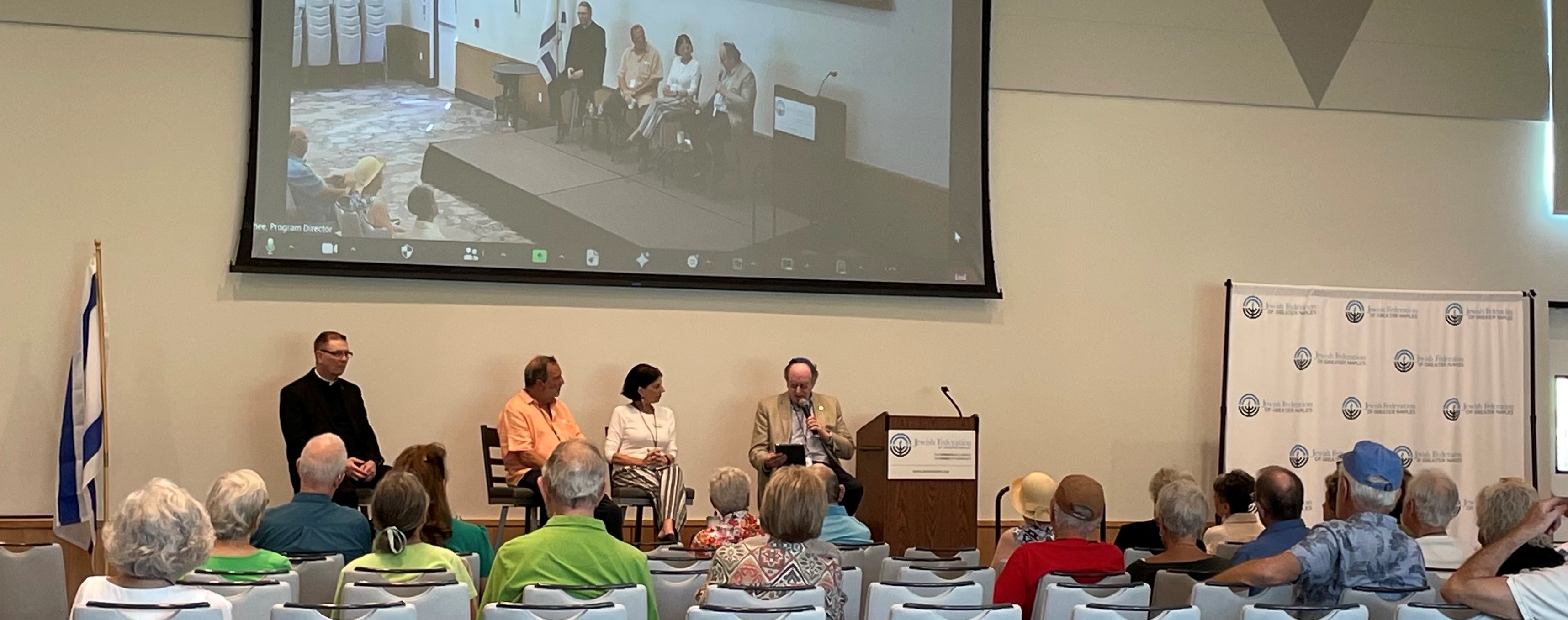 Participating panelists: Bishop Frank Dewane, Diocese of Venice; Dr. Matthew Tapie, director of the St. Leo University Center for Catholic-Jewish Studies; Dr. Robert Ventresca, president, King’s University College; Rabbi James Rudin, retired director of interfaith relations, American Jewish Committee; Rabbi Mark Gross, Jewish Congregation of Marco Island; attorney Martin Kaplan; theology professor T. Adam Van Wart, Ave Maria University; and Rabbi Stephen Fuchs, Temple Beth Shalom, Vero Beach.