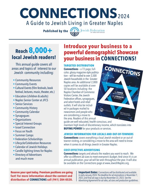 Connections is a full-color, glossy annual publication that covers everything one should know when it comes to all things Jewish in the Greater Naples area.